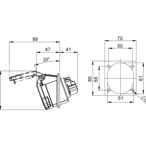 Ổ cắm mặt bích CEE (Góc) 16A 200-250V 2P + PE 6h IP44 Kết nối vít (70mmx85mm),Ổ cắm công nghiệp, loại âm thẳng, loại thẳng chuẩn IEC, 2P+PE, 16A, 200-250V, IP44, 6H, Ổ cắm mặt bích (Góc), 16A,200-250V ,2P+ PE, 6h, IP44, Màu: xanh lam, Kết nối vít, Mặt cắt cáp: 1-2.5mm²
